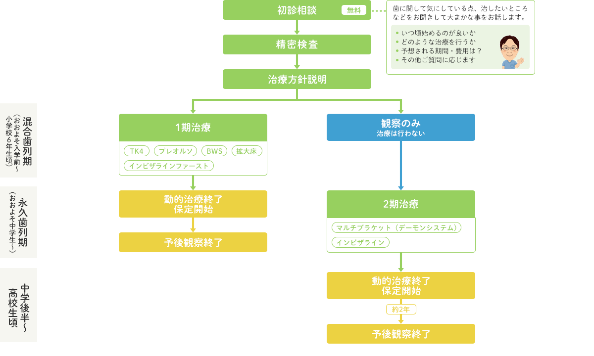 矯正治療期間(矯正機関)は、従来の方法と比較して、さほど変わりませんが、通院回数では、従来の方法に比べかなり少なくなります。特に小児期の場合は生え変わりの状態にもよりますが、約半分程度になることも多いです。
