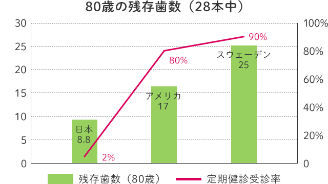 80歳になった時、残っている歯の本数は…スウェーデン25本、アメリカ17本、日本はなんと8本です。